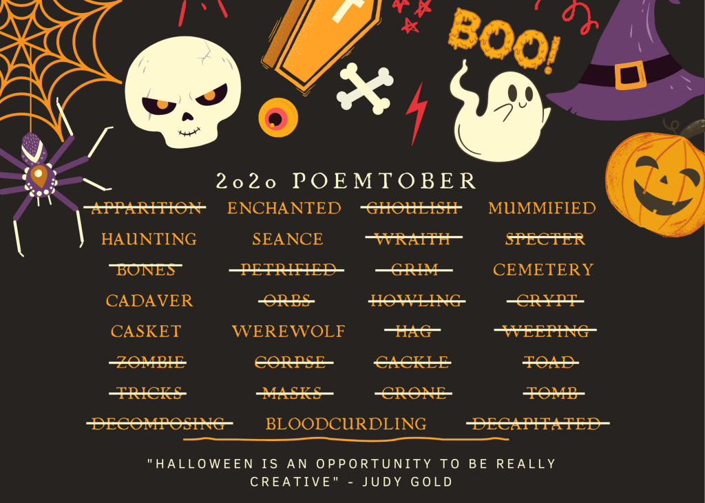 Just 9 more poems to write! My goal is to have 7 more for next Friday and then the final 2 on the 24th, along with my 2021 Poemtober list reveal.