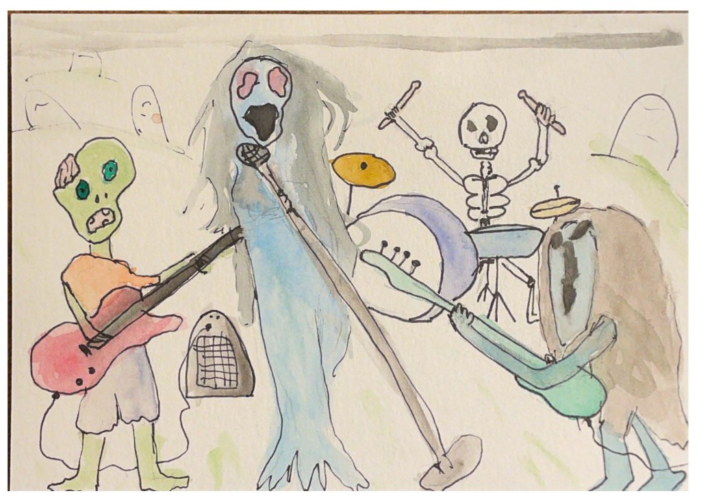 I liked this one enough that I think I will work on better drafts down the road. I’m a little miffed that that I was too lazy to check which monster I had playing which guitar and got it backwards in the drawing. Ah well.